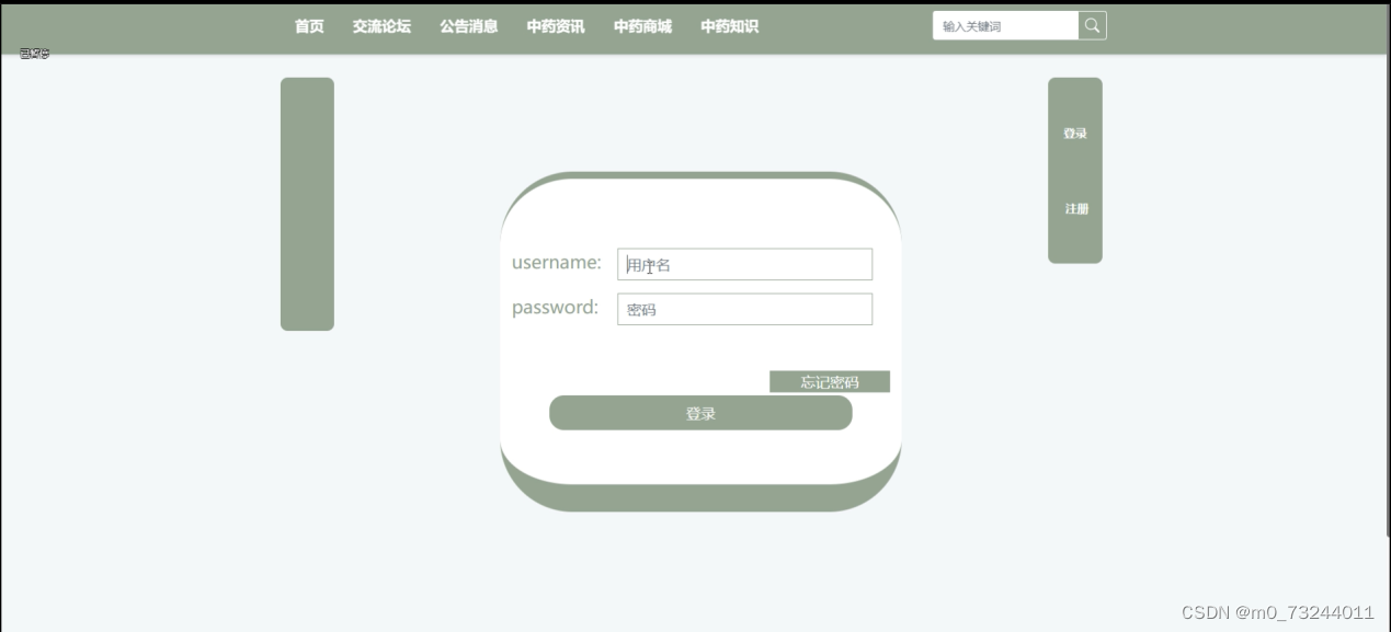 (1)注册登录模块:用户想要进入本中药知识分享网站系统中对信息进行评论、交流以及中药知识等操作的时候,就必须要登录到系统当中,要是新的用户没有中药知识分享网站系统的账号的话,点击“注册”按钮,就会进入到新用户注册这个界面上,用户输入对应的账号(必须填写)+密码(必须填写)+确认密码(必须填写,而且要与密码一直)+昵称+邮箱+手机号+选择用户身份等等,,然后点击“注册”,系统在用户这一数据库中会查询账号是不是存在,两次密码是不是一样,都填写正确就会注册成功,然后再进行登录,如果是之前已经注册过的用户很长时间没有使用,忘记密码,也可以点击“忘记密码”进行找回;