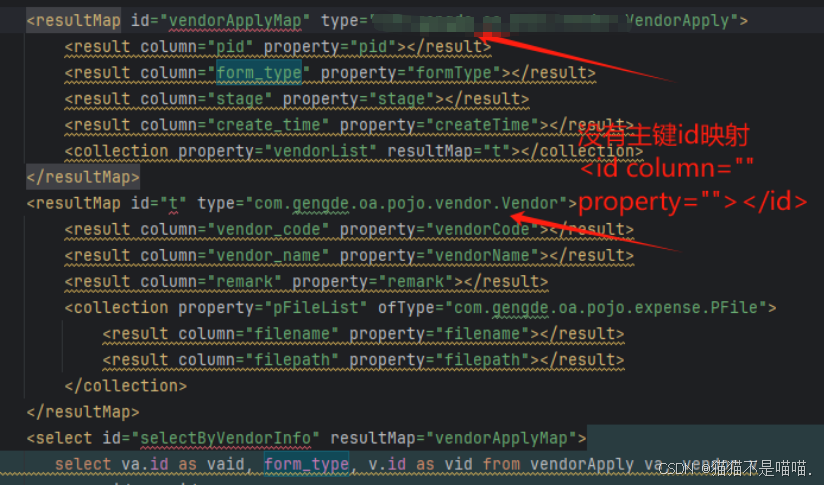 - 做映射时,需要为每个表做主键映射:<id column="id" property="id"></id>