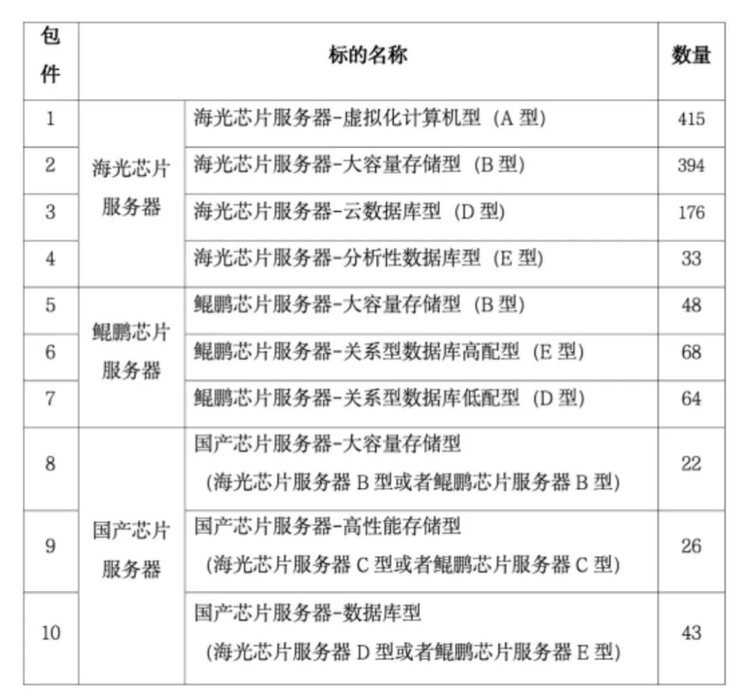 鲲鹏芯片服务器:采购数量为180台,占比14%。