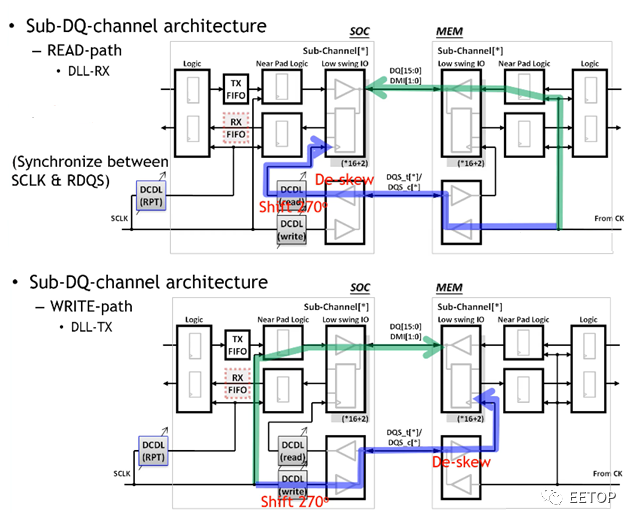 台积电IP团队针对SoC到内存接口的特定情况开发了一种创新方法。存储器小芯片可能不一定嵌入DLL来捕获信号输入。对于非常宽的接口(例如,将512个地址,256个数据位分成多个子通道),成本敏感型存储芯片中DLL电路的开销会很高。如下图所示,在SoC中出现了DLL相位输出,它用作存储器写周期的输入选通脉冲。(图中还显示了存储器读取路径,该路径说明了如何将来自存储器的数据选通脉冲连接到read_DLL电路输入。)