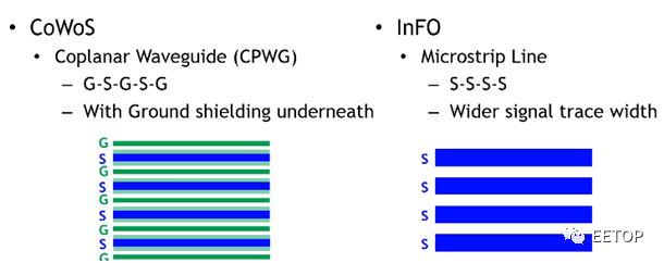 物理信号的实现方式会有所不同,具体取决于封装技术。具有硅中介层的2.5D封装的信号重新分配层(RDL)将利用可用的更精细的金属间距(例如,TSMC的CoWoS)。对于利用重组芯片衬底嵌入芯片的多芯片封装,RDL层要厚得多,间距要大(例如,TSMC的InFO)。下图说明了与CoWoS和InFO设计相关的典型信号走线屏蔽(和无屏蔽),以及相应的信号插入和远端串扰损耗。