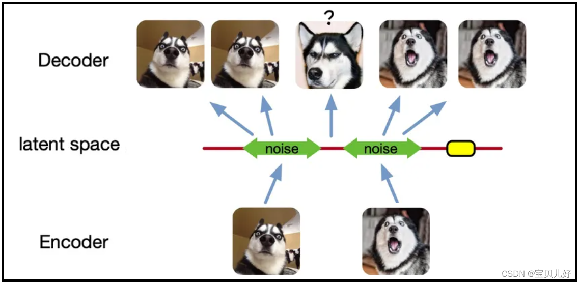 此时的AE根本就称不上是一个生成模型!因为我必须要输入A或者输入B,才能生成狗1或者狗2。即使我们训练100万张狗,也只是确定的这100万个数字,只能生成对应的100万只狗!也就是latent space永远是一个有限的、离散的空间。假如我们给解码器输入C,而C不在latent space上,此时我们会发现解码器给我们返回的图片不仅模糊而且还是乱码的。呜呜呜。。。