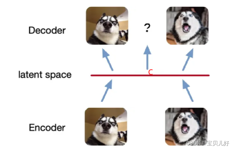 我期望的生成模型应该是我输入C点能给我生成一张既像狗1又像狗2的狗图啊。或者我输入一个任意的随机数,解码器能给我生成一只狗,至于这只狗长啥样,anyway,我不care了,反正都是狗就可以了。这才是真正的生成模型!
