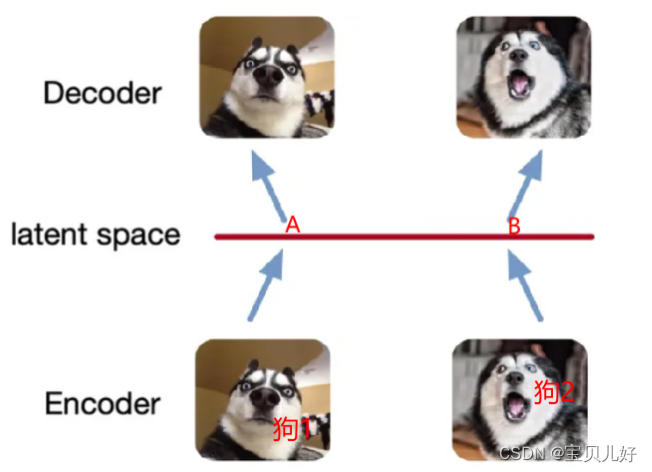 当上图的架构训练完毕后,我就可以扔掉编码器,只要解码器。当我给解码器输入一个在数A,解码器就可以帮我生成一张狗1的图像了;当我给解码器输入一个数B,解码器就帮我生成一张狗2的图像了: