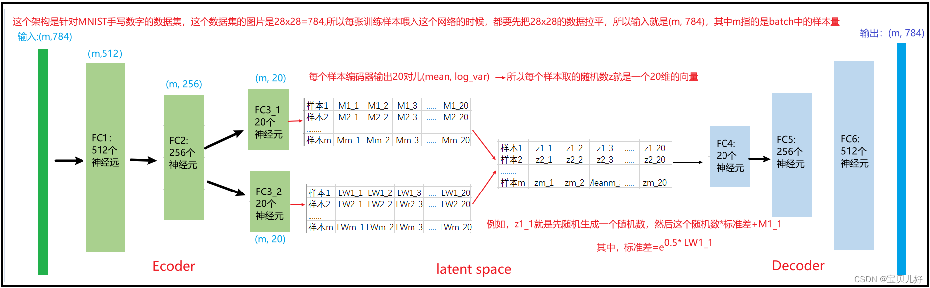 由于后面我还要写一个实现案例,就是用手写数据集MNIST来训练一个VAE,看看效果。所以这里的架构我就画成针对这个数据集的架构了: