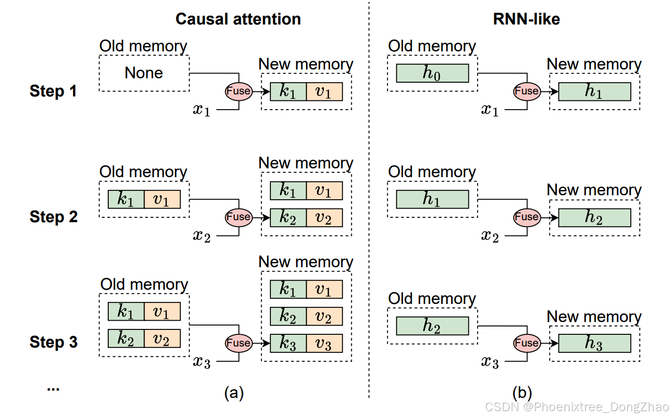 Figure 2: The mechanism illustration of causal attention and RNN-like models from memory perspective, where xi denotes the input token of i-th step. (a) Causal attention stores all previous tokens’ keys k and values v as memory. The memory is updated by continuously adding the current token’s key and value, so the memory is lossless, but the downside is that the computational complexity of integrating old memory and current tokens increases as the sequence lengthens. Therefore, attention can effectively manage short sequences but may encounter difficulties with longer ones. (b) In contrast, RNN-like models compress previous tokens into fixed-size hidden state h, which serves as the memory. This fixed size means that RNN memory is inherently lossy, which cannot directly compete with the lossless memory capacity of attention models. Nonetheless, RNN-like models can demonstrate distinct advantages in processing long sequences, as the complexity of merging old memory with current input remains constant, regardless of sequence length.