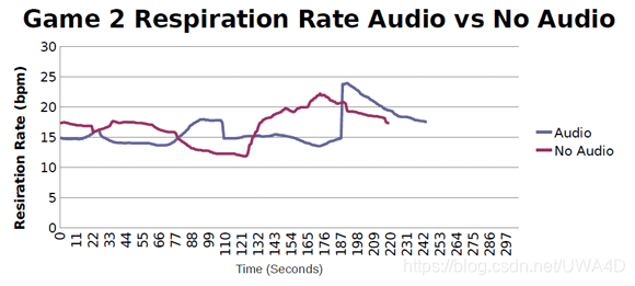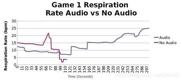 首先,对结果进行总结:在游戏1中,与无音频组相比,音频组的心率明显更高,呼吸频率略高。 在游戏2中,音频组的心率和呼吸频率比无音频组高。