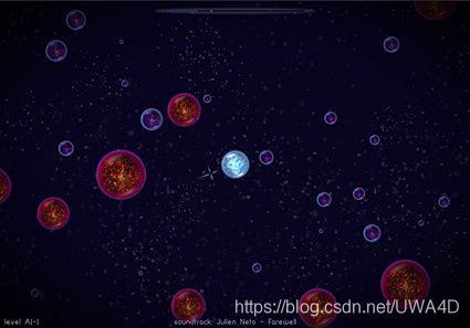 Osmos的目的是将自身(单细胞生物,微粒)推向更小的颗粒(明亮的蓝色球体)以吸收它们。 单与比自己大的微粒相撞会导致自己被吸收,从而导致游戏结束。 改变路线是通过驱逐群众来完成的。 由于动量守恒,这导致玩家的微粒远离被驱逐的物体移动,但也导致其微粒收缩。