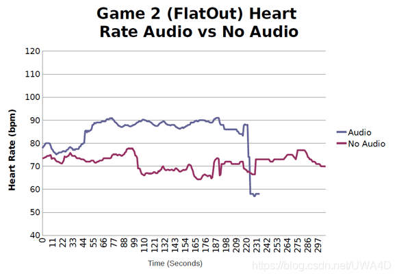 在游戏2(FlatOut)中,与无音频组相比,音频组产生了最高的心率(91bpm),呼吸频率略高。 这些高价值的基本原理是FlatOut是一款令人兴奋的赛车游戏,音频方面(引擎噪音,碰撞声效果和背景摇滚音乐)更是如此。 此外,游戏中参与者的表现可能会影响响应-例如,如果玩家获胜,他们可能会兴奋地做出响应(增加心脏和呼吸频率),或者如果玩家输了,他们可能会感到沮丧,也增加了心跳感、呼吸频率。
