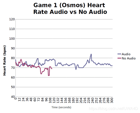 在游戏开始时,两组的心率均约为每分钟75次(bpm)。 音频组玩游戏的时间更长,但始终显示出始终较高的心率,并且最大和最小心率值更高(音频组最大84bpm,最小68bpm;无音频组最大78bpm和最小61bpm)。进一步分析发现,这种心率差异显著(Mann-Whitney,p <0.001)。