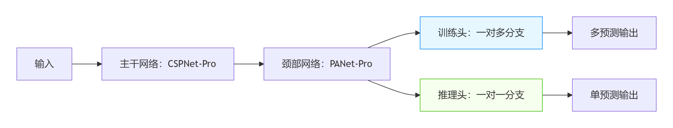 - 🟦 训练头:一对多分支提供丰富监督信号