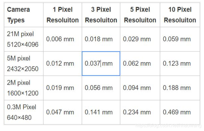 精度的单位是mm。根据产品表面和照明状况的不同,我们可以通过放大图像观察辨别稳定像素的个数,从而得出精度。如果条件不允许实际测试观察,一般的规律是,如果使用正面打光,有效像素为1个,使用背光,有效像素为0.5个。