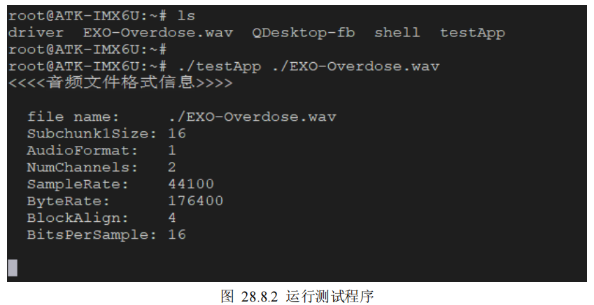 将编译得到的可执行文件拷贝到开发板 Linux 系统/home/root 目录下,并准备一个 WAV 音频文件,接着我们执行测试程序: