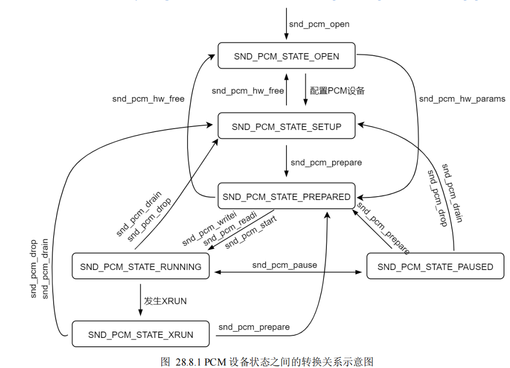 当调用 snd_pcm_drop()或 snd_pcm_drain()停止 PCM 设备后,设备将回到 SND_PCM_STATE_SETUP 状态。