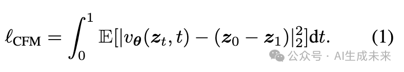 使用由参数 参数化的 J-DiT 来预测将噪声转换为干净潜在表示的速度场。流匹配的训练目标是直接回归目标速度场,从而得到条件流匹配(Conditional Flow Matching, CFM)损失: