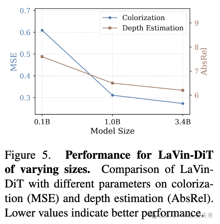 除了训练动态外,模型大小对下游任务性能也有显著影响。这在着色和深度估计任务中得到了体现,这些任务因其在捕捉颜色保真度和空间结构上的不同要求而被选中。如下图5所示,随着模型规模的增加,性能持续提高。具体而言,在着色任务中,3.4B模型的MSE为0.273,显著优于1.0B和0.1B模型的MSE,分别为0.311和0.609。同样,在深度估计中,3.4B模型的AbsRel为6.2,而1.0B和0.1B模型分别为6.5和7.6。这些结果表明,较大的模型在多个任务中确实能提供更强的性能,证明了LaVin-DiT是一个可扩展且适应性强的高性能视觉应用框架。