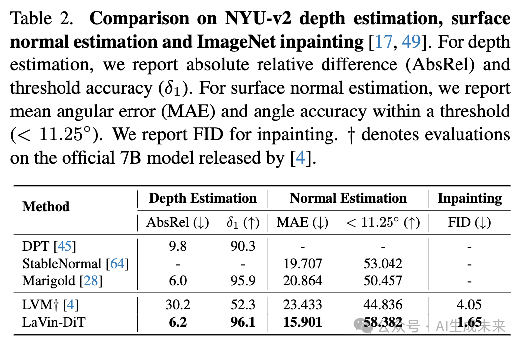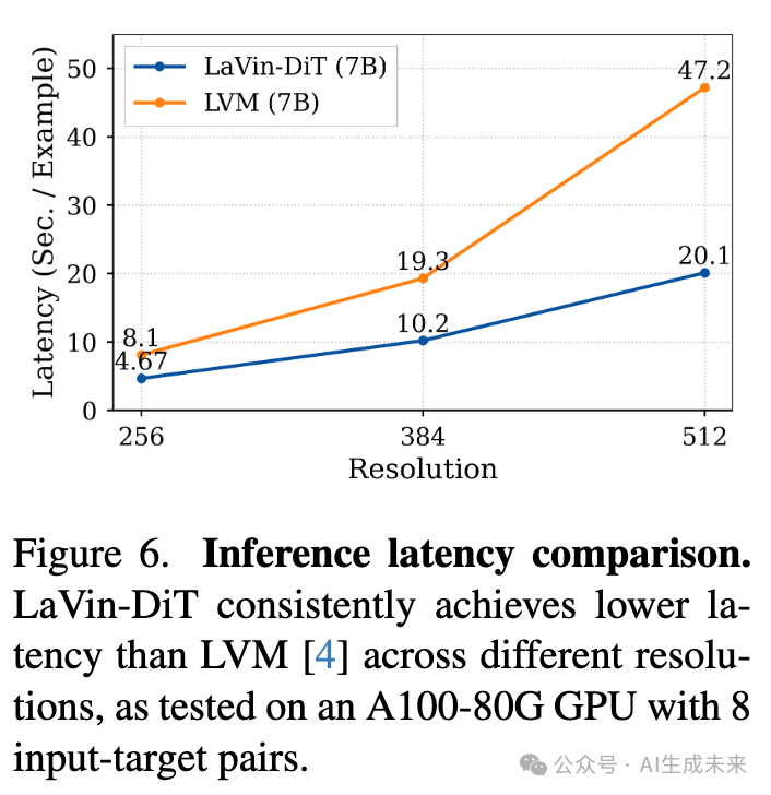 如下图6所示,比较了LaVin-DiT和LVM(两者均为7B模型)在不同分辨率下的推理延迟,结果表明本文的方法始终更高效。在256分辨率下,LaVin-DiT每个样本仅需4.67秒,而LVM需要8.1秒;在更高分辨率下(例如512分辨率时,LaVin-DiT为20.1秒,LVM为47.2秒),这一效率差距进一步扩大。这个差异突显了扩散模型在视觉任务中的一个关键优势:与逐步处理tokens的自回归模型不同,扩散模型可以并行处理tokens,从而在面对较大输入时能够更有效地扩展。这种并行性使得我们的LaVin-DiT在大规模视觉应用中成为更合适的选择。