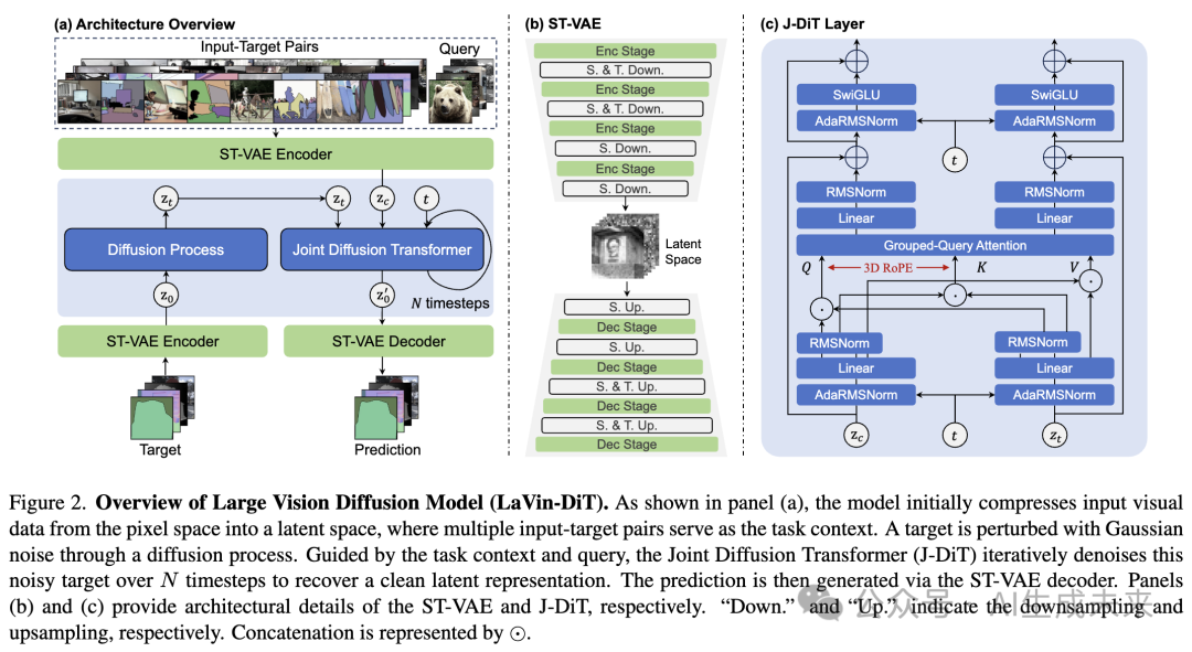 如下图 2(a) 所示,提出的大型视觉Diffusion Transformer(LaVin-DiT)框架将空间-时间变分自编码器(ST-VAE)与联合扩散Transformer(J-DiT)结合起来,实现多个视觉任务的统一。给定一个视觉任务,例如全景分割,首先采样一组输入-目标对作为任务定义。随后,这组样本和其他视觉示例被输入到 ST-VAE 中,并编码为潜在表示。接着,编码后的表示被分块并展开为序列格式。样本集和输入视觉数据形成条件潜在表示 ,而目标通过添加随机高斯噪声变为噪声潜在表示 。随后, 和 被输入到联合扩散Transformer(J-DiT)中,通过去噪 恢复清晰的潜在表示,并保持在共享的潜在空间内。最后,恢复的潜在表示通过 ST-VAE 解码器还原为原始像素空间中的目标。