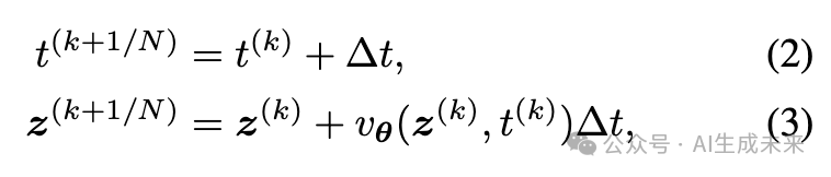 其中时间步 。该前向过程在沿着线性路径的方向 上诱导了一个时间相关的速度场 。该速度场定义了一个常微分方程(ODE):