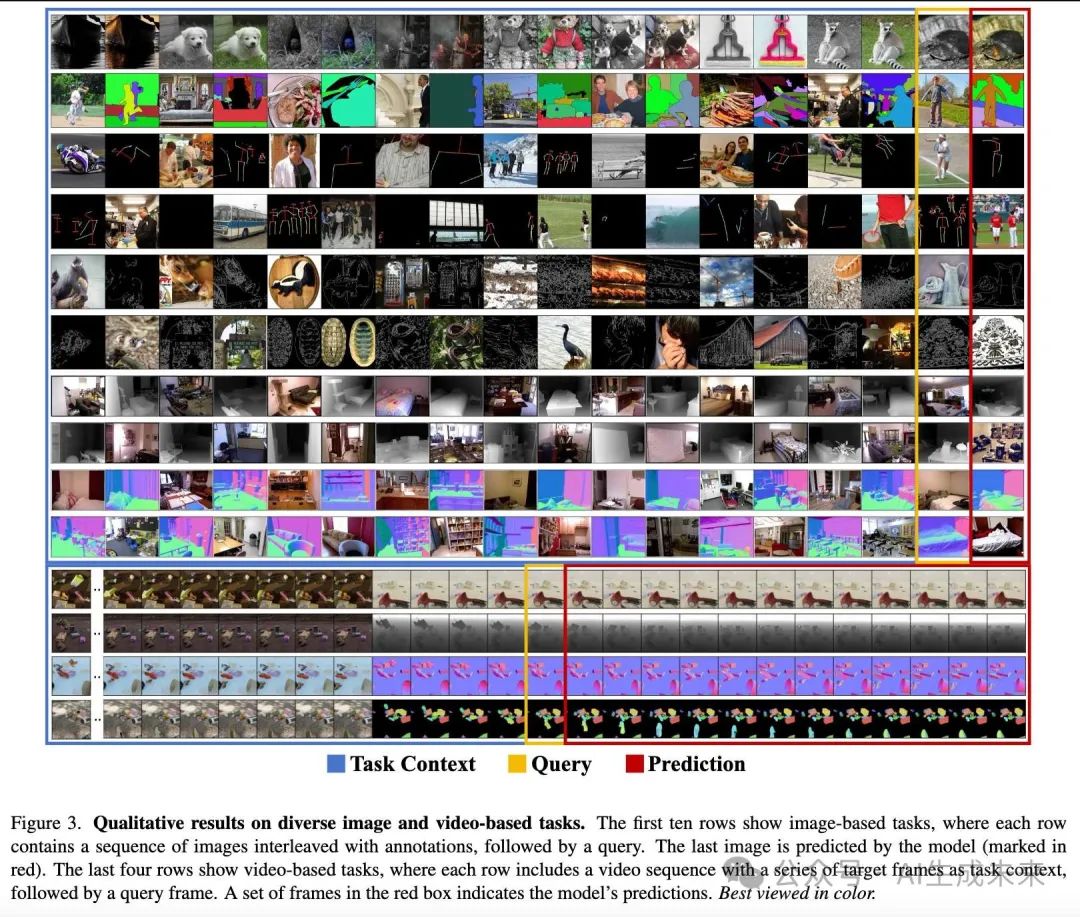 定性分析如下图3所示,展示了在多种基于图像和基于视频的任务中的定性结果。我们的模型始终遵循任务上下文,并准确地生成相应的预测。此外,给定带有任务上下文的连续帧,模型能够生成接下来的12帧预测,展示了其有效处理时间一致性和场景动态的能力。