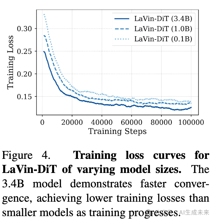为了研究所提出的LaVin-DiT的可扩展性,进行了三个模型大小(0.1B、1.0B和3.4B参数)的实验,训练了这三个模型100,000步。下图4展示了训练损失曲线,结果显示,较大的模型在训练过程中始终能够取得较低的损失值。此外,3.4B模型收敛速度更快,在更少的训练步骤内达到了较小的损失值。这一加速收敛表明,较大的模型更适合捕捉复杂的数据模式,从而提高了学习效率。观察到的训练动态强调了在复杂视觉任务中扩展模型容量的优势,较大的模型能够更有效地捕捉多样的数据特征。