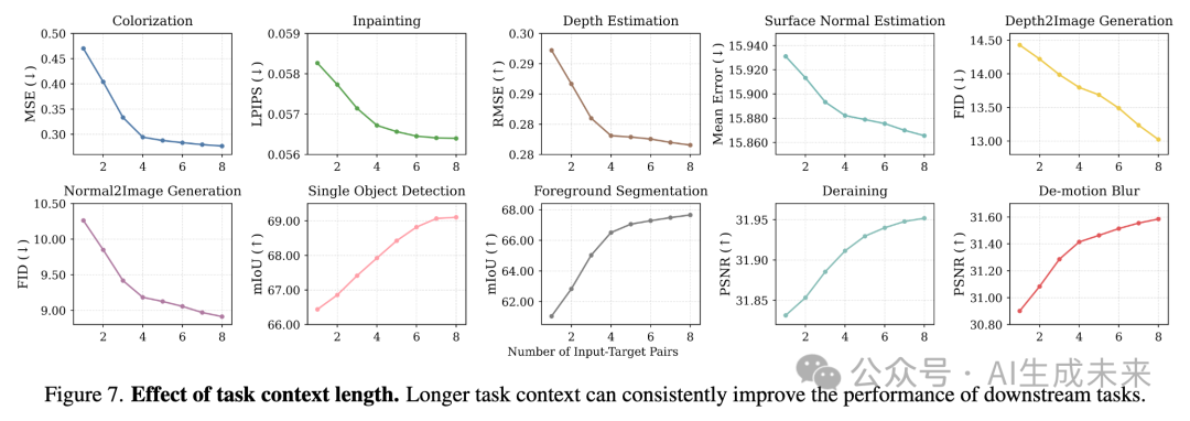 上下文学习使得模型能够通过少量示例适应新任务,随着提供更多示例,性能通常会提高。我们通过评估任务上下文长度对十个下游任务的影响来进行研究。如下图7所示,模型在任务上下文变长的情况下,性能持续提升,取得了显著的性能增益。例如,随着更多输入-目标对的引入,LaVin-DiT在深度到图像生成任务中取得了更低的FID,并在去除运动模糊任务中实现了更高的PSNR。这些结果表明,LaVin-DiT能够有效利用扩展的任务上下文,突出其利用额外信息来增强任务适应性和准确性的能力。