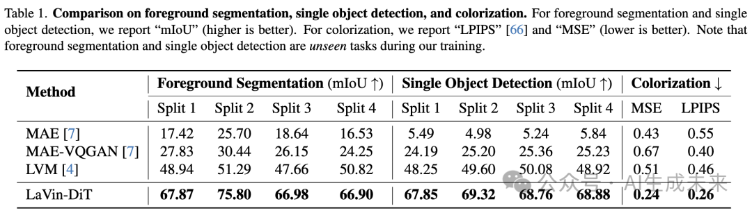 如上表1所示,报告了在不同分割上的前景分割和单物体检测任务的性能。LaVin-DiT在所有分割上都取得了显著的提升。在前景分割任务中,在四个分割上分别达到了67.87%、75.80%、66.98%和66.90%的mIoU,始终大幅超过了LVM和MAE-VQGAN等先前方法。