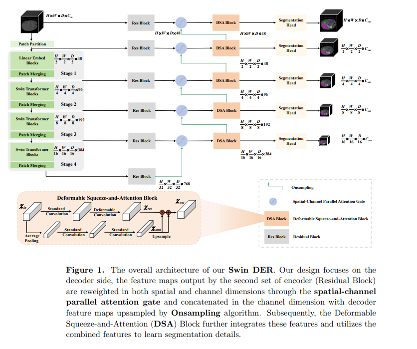 这篇文章介绍了一种改进的医学图像分割网络,名为Swin DER,专注于优化解码器(decoder)设计,以提高分割细节的优化能力。Swin DER基于Swin UNETR,通过具体优化解码器的三个关键部分:上采样(upsampling)方法、跳跃连接(skip connection)和特征提取模块,从而提升医学图像分割的性能。