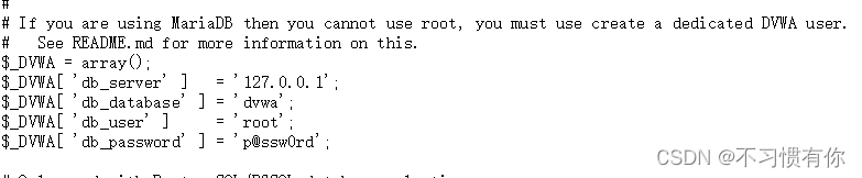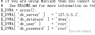 c.打开config.inc.php文件,db_server为本地服务器127.0.0.1,db_database为 连接的数据库名dvwa,db_user为数据库的用户,db_password为数据库的密码。(可根据自己的数据库做出调整,我首先打开phpstudy的cmd创建一个dvwa库,然后将db_password的值改为了root,因为我的数据库密码为root,root。)