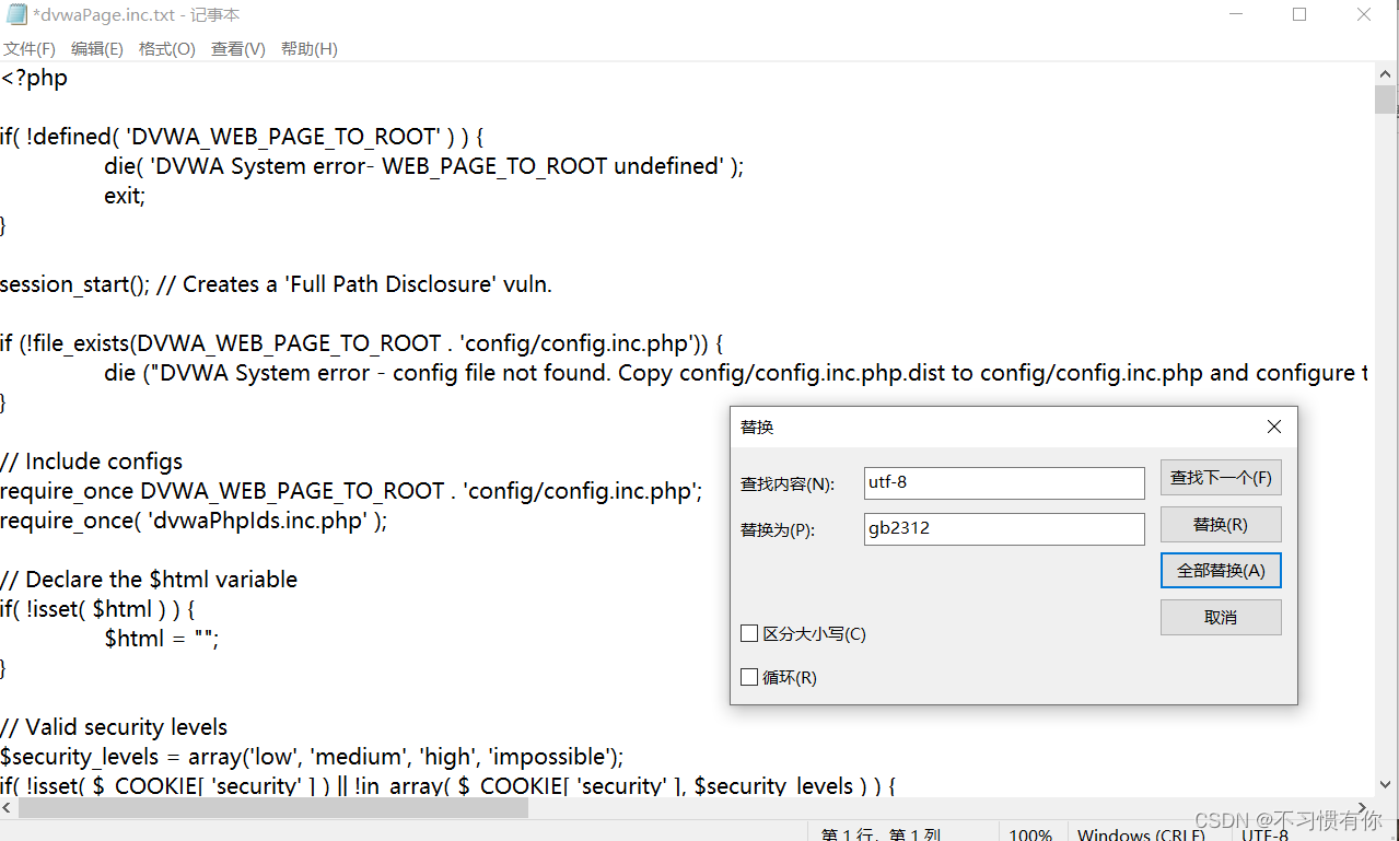 e.如果出现乱码,打开phpstudy\WWW\DVWA\dvwa\includes中的dvwaPage.inc.php文件,将里面的utf-8全部改为gb2312