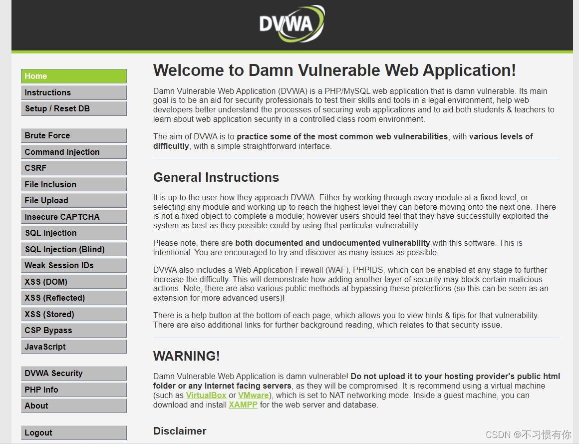 DVWA登录后为下面这样子说明搭建成功。那就开心的在渗透测试的海洋里遨游。