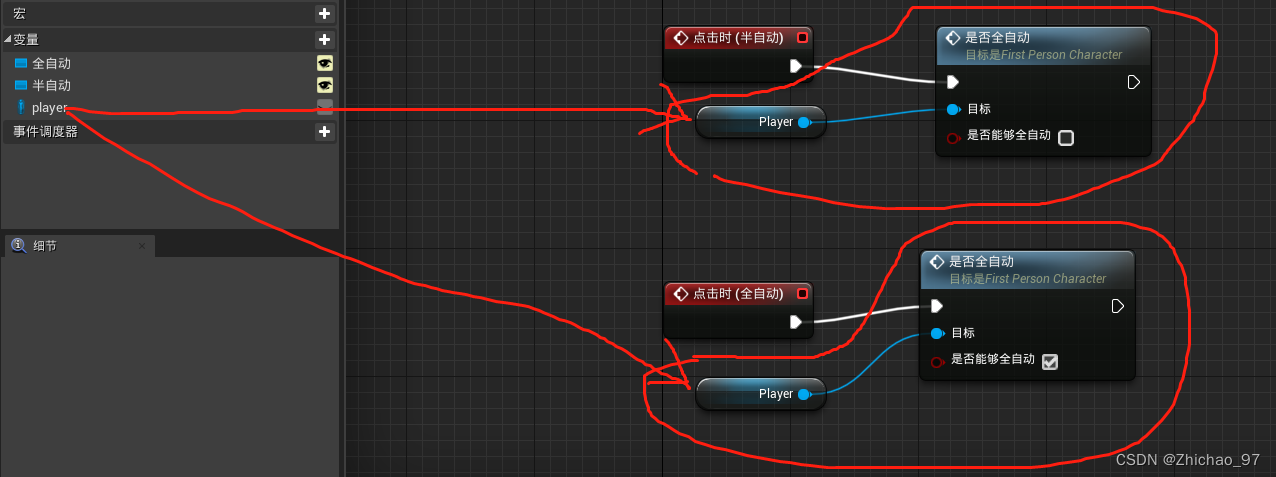 首先在第一人称的蓝图中添加一个自定义事件,命名为是否全自动