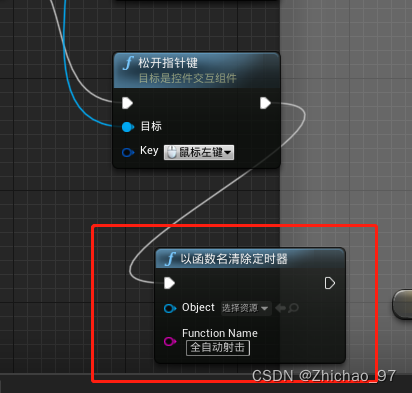 创建 以函数名设置定时器 节点,表示延迟0.1s执行全自动射击事件
