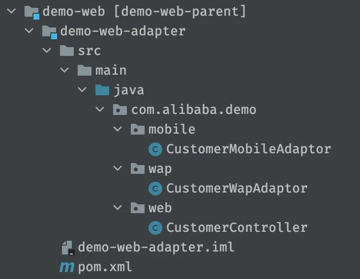 首先是 demo-web-adapter 模块,这名字是不是很新鲜?但其实,可以理解为平时我们用的 controller 层(对于 Web 应用来说),换汤不换药。