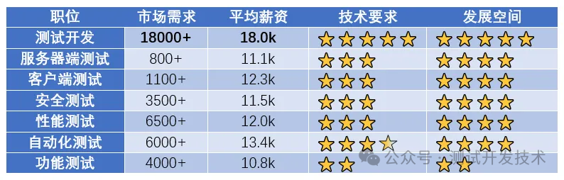据某招聘官网上搜索测试开发的市场需求量,仅仅北京就有 1.8w 以上,性能测试和自动化测试次之,为6k左右;根据某招聘网站的统计,北京测试开发的平均月薪达到18k以上,远远高于其他测试岗位。
