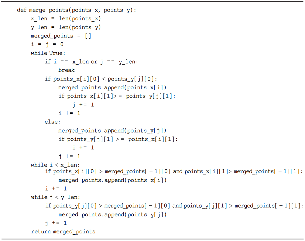首先定义一个merge_points()函数,完成跳跃点集合的归并排序。接收两个有序的点集,将其归并为一个有序的点集。其代码如下: