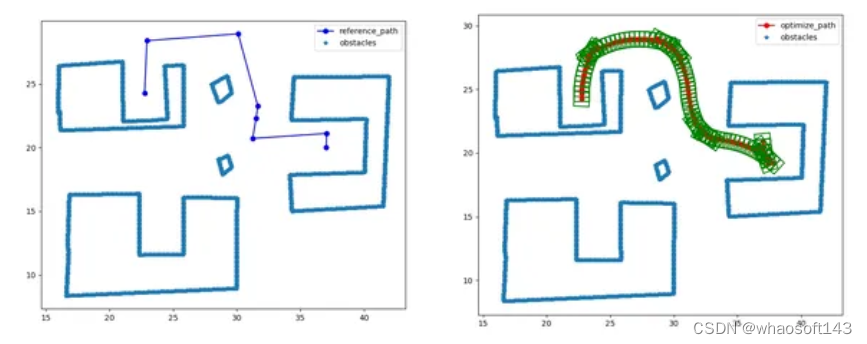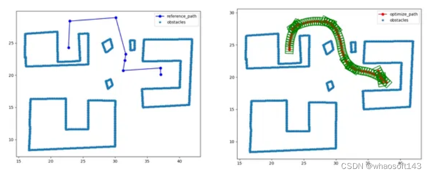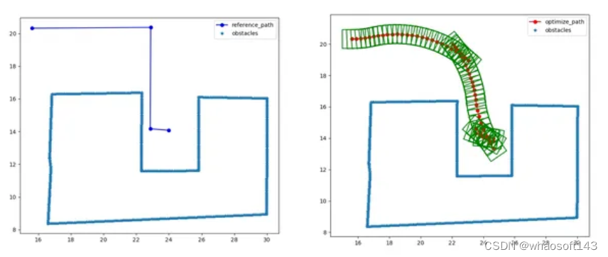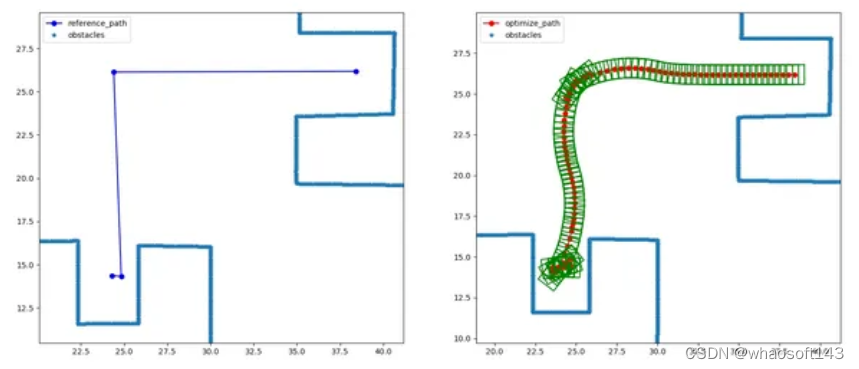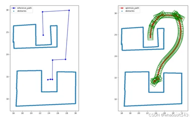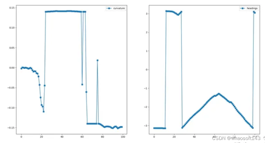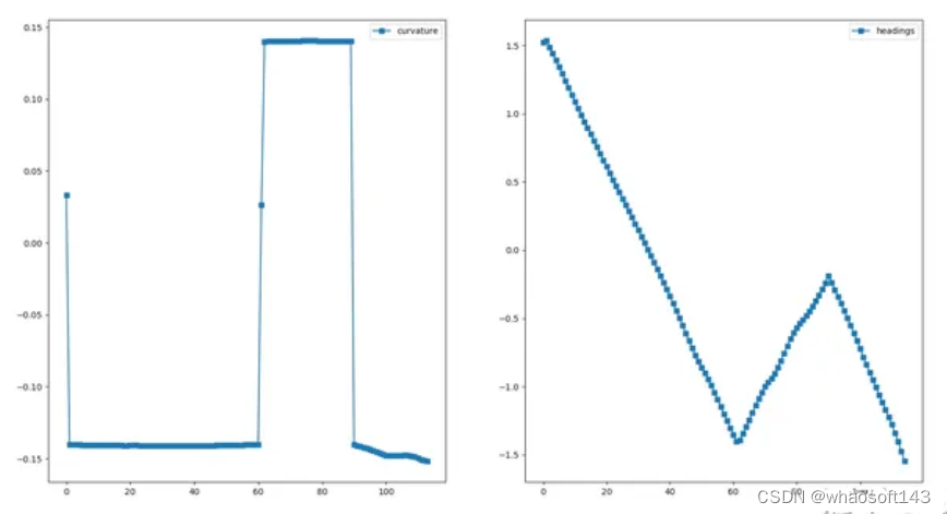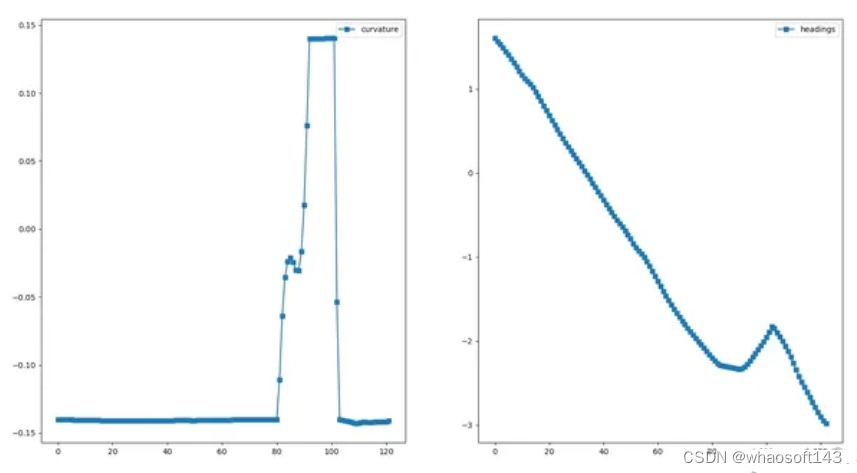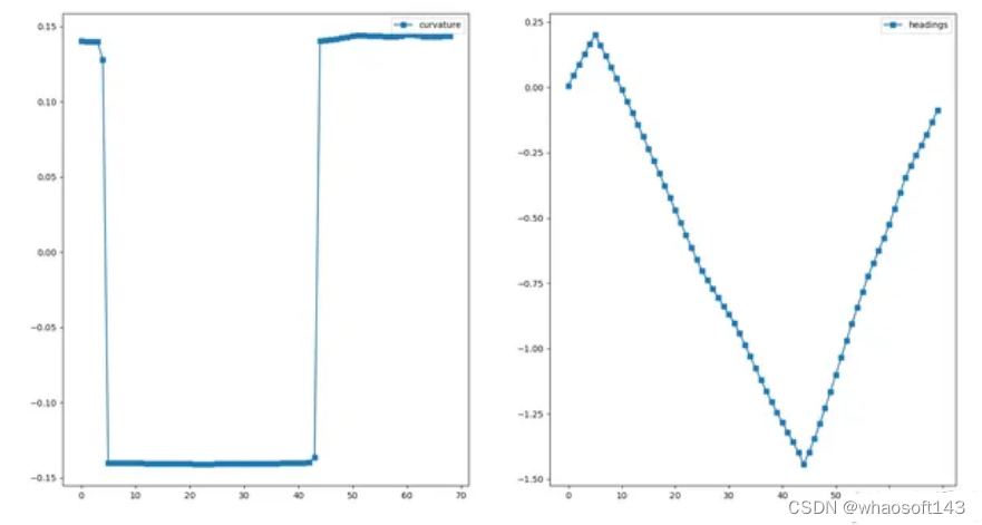 我以为测试结果会很差,结果还是有点出乎意料的,虽然有的时候会出现无解,但是只要初始线段给的好一点就不会出问题,优化的速度也挺快平均时间大概是0.3s, 路径的质量的评价我觉得主要是看平滑度和曲率大小,只要曲率不会超过车辆最小转弯半径就可以了, 这里我设置的曲率最大是0.155, 列了几组测试图,第一个是直线段参考线和优化后的路径图,第二幅是对应的曲率和航向 whaosoft aiot http://143ai.com