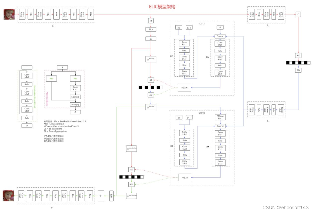 图8ELIC模型结构(红色箭头代表压缩路线,绿色箭头代表解压路线,紫色箭头代表共用路线)