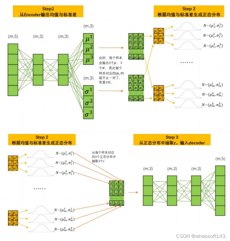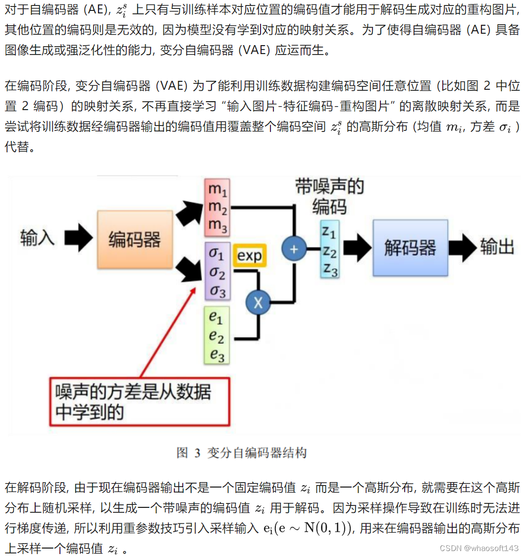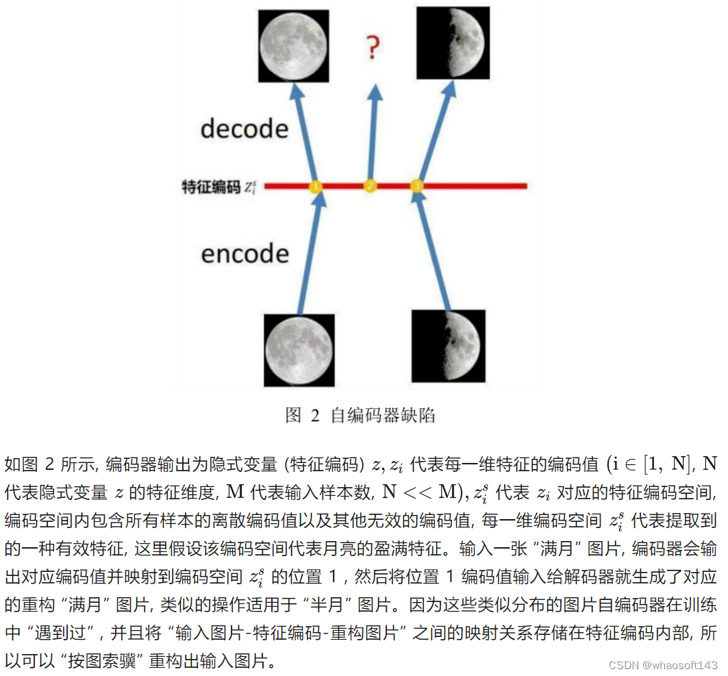 但是如果我们输入一张 “四分之一月” 的图片或者直接在编码空间取位置 1 和 3 之间的位置 2 编码值, 输入解码器是否能重构出输入图片呢? 此时解码器由于缺少对应 “特征编码 -重构图片” 对应的映射关系, 两个相邻编码值之间也不存在任何关联, 模型也无从知道位置 2 编码值的重构结果应该介于位置 1 和 3 编码值之间, 输出结果就会出现模糊或乱码。这也说明了自编码器存在泛化性差且不具备生成能力的缺陷。
