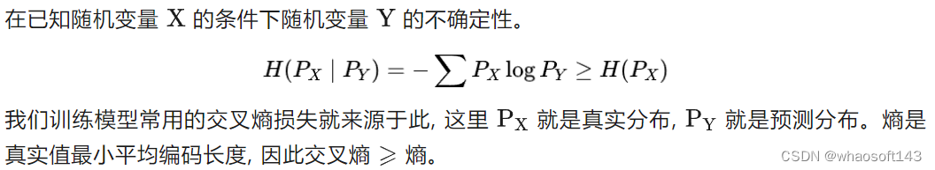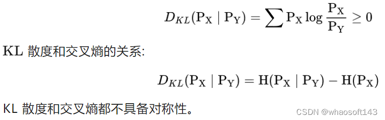 也叫相对熵。用于衡量两个概率分布之间的差异。其值越大, 则两个概率分布的差异越大; 当两个概率分布完全相等时相对熵值为 0 。