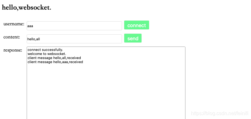 启动springboot服务,然后用浏览器打开页面http://localhost:8000/springboot/ws,在用户名输入框中输入一个名字,然后点击“connect”按钮,就连接websocket服务了,接着在message输入框中输入消息,就可以点击“send”按钮发送,然后下方的消息显示框就可以显示消息了。
