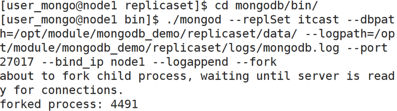 ./mongod --replSet xxx --dbpath=/opt/module/mongodb_demo/replicaset/data/ --logpath=/opt/module/mongodb_demo/replicaset/logs/mongodb.log --port 27017 --bind_ip node1 --logappend --fork