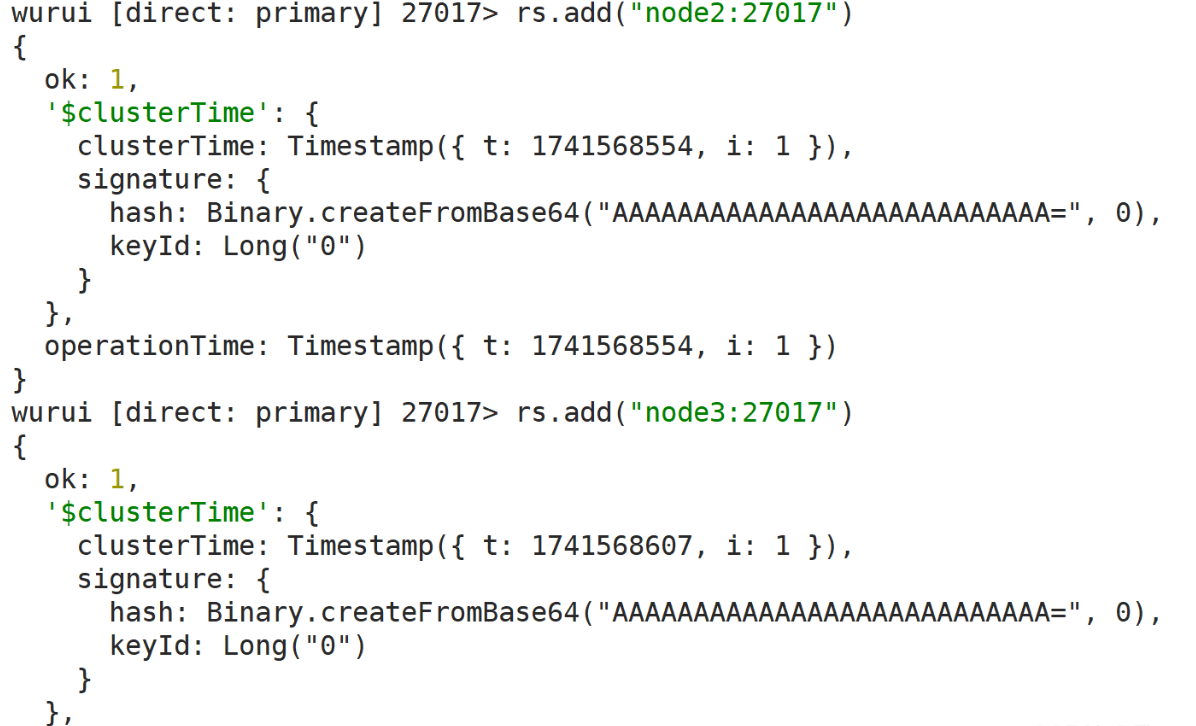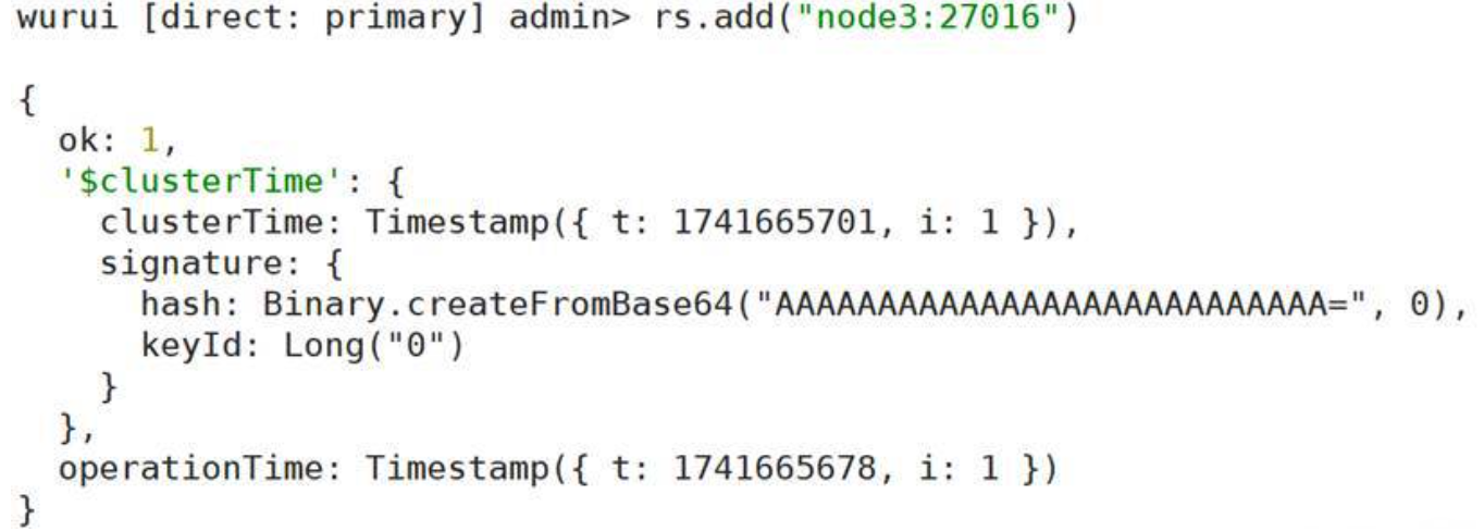 2. 在副本集主结点将服务器node3上新启动的 MongoDB 以副本结点的形式添加到副本集
