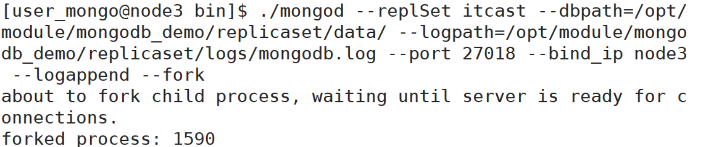 ./mongod --replSet itcast --dbpath=/opt/module/mongodb_demo/replicaset/data/ --logpath=/opt/module/mongodb_demo/replicaset/logs/mongodb.log --port 27018 --bind_ip node3 --logappend --fork