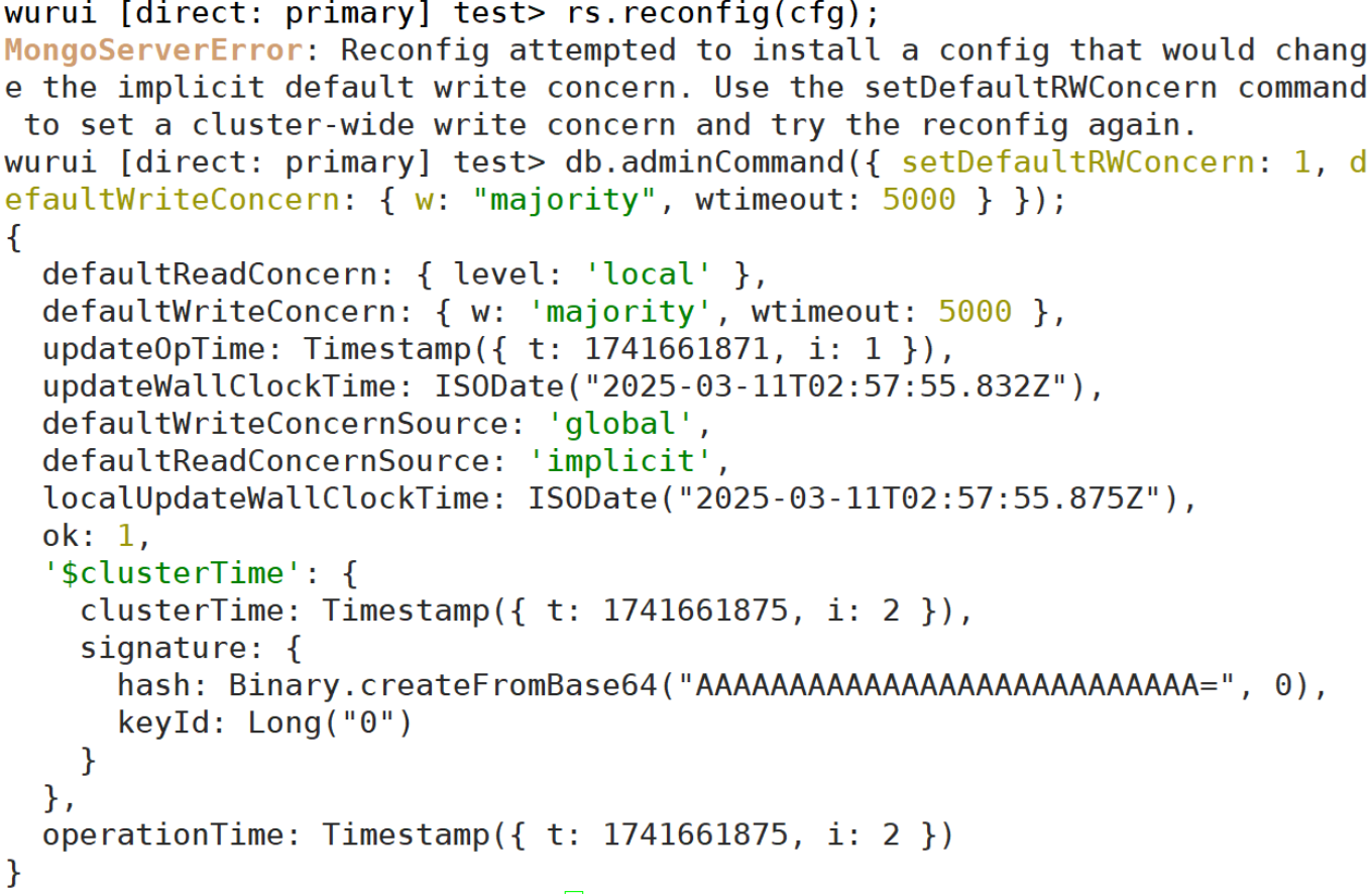 错误提示 BSON field 'MemberConfig.slaveDelay' is an unknown field 表示 slaveDelay 这个字段在 MongoDB 配置中是不被识别的,导致 rs.reconfig(cfg) 执行失败。事实上,MongoDB 中并没有 slaveDelay 字段用于副本集成员的配置。