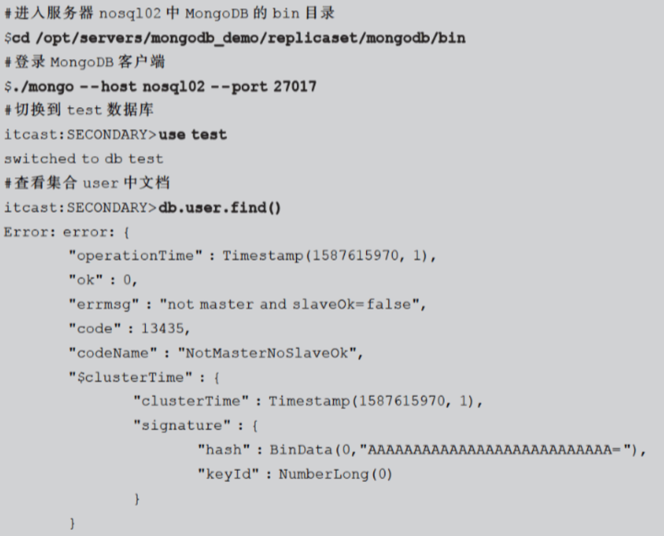 (2)在服务器node2(副本结点)中登录MongoDB客户端,查看数据库test下的集合user中是否存在与主结点一致的文档内容,具体命令如下: