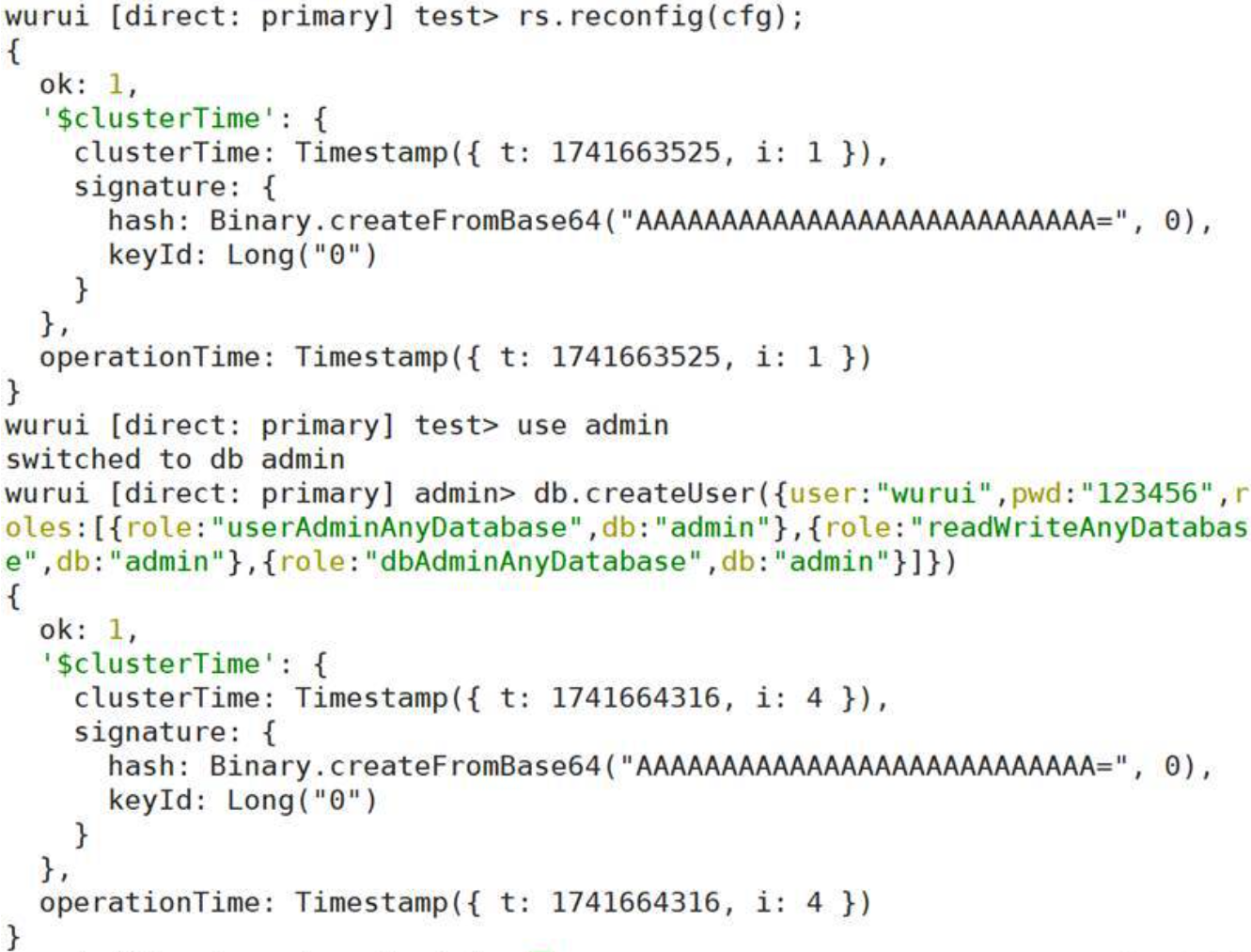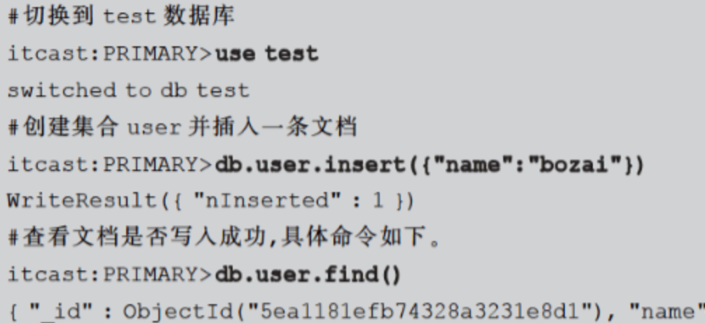 通过上述操作,成功在副本集主结点的数据库test中创建集合user并插入一条文档。