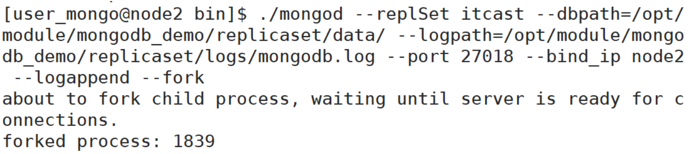 ./mongod --replSet itcast --dbpath=/opt/module/mongodb_demo/replicaset/data/ --logpath=/opt/module/mongodb_demo/replicaset/logs/mongodb.log --port 27018 --bind_ip node2 --logappend --fork