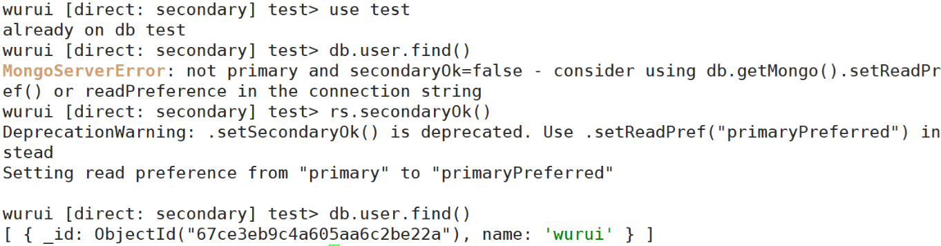 注:MongoDB 旧版本中,rs.secondaryOk() 用于允许从 secondary 副本集成员读取数据。但在较新版本(MongoDB 4.2 及以上),官方改进了 读偏好(Read Preference) 机制,推荐使用 setReadPref() 来设置读取策略。