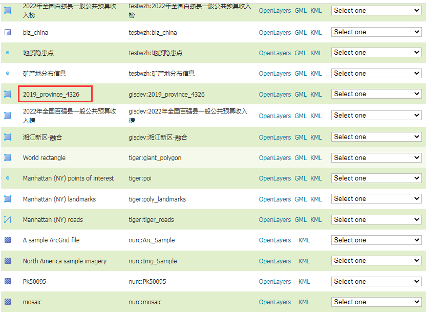 请注意,2019_province_4326表示在Geoserver发布的图层的名字。在GeoServer中可以查看到